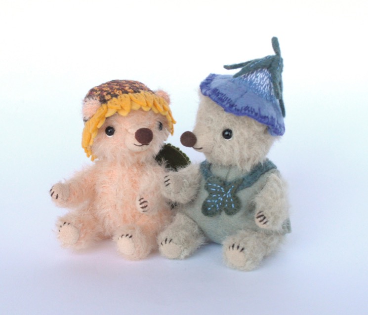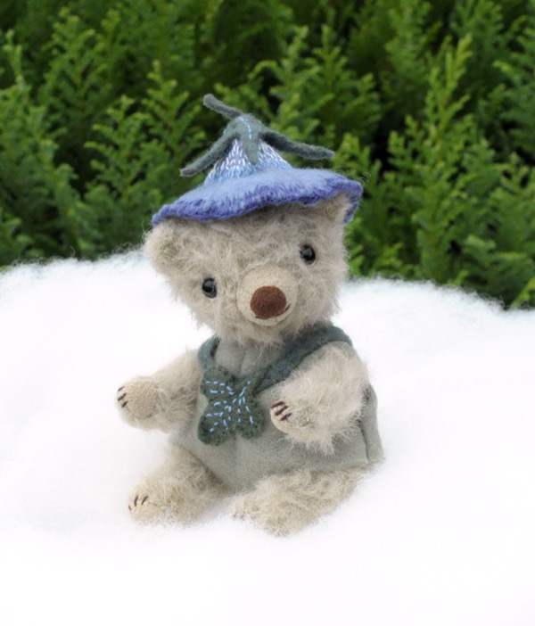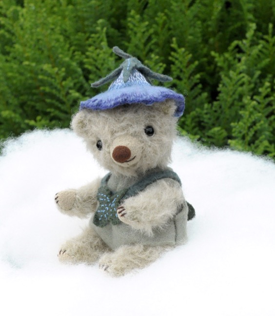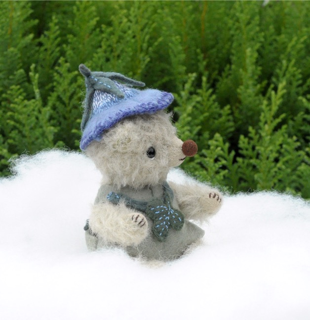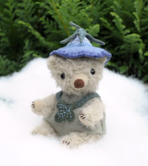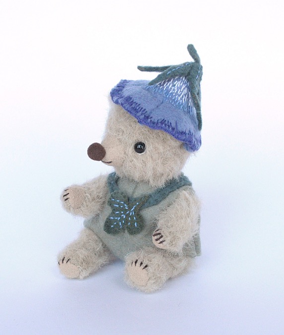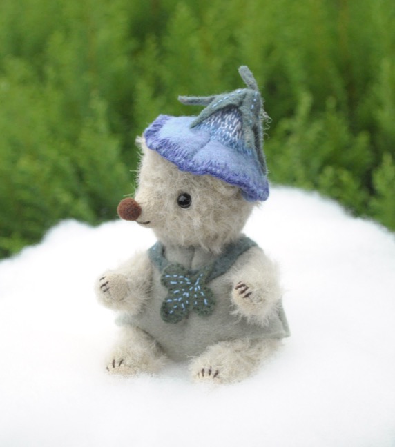 深みのある綺麗なブルーです。モヘアを触るとカシャカシャした触感があり、まさにモミの葉のイメージです。フェルトのお洋服にはモミの葉がチクチクチクチクとリズムよく刺繍されています。モミちゃんはそれがとっても嬉しいのです。三角帽をかぶっているせいか森の小人のようですね。アリエッティの親戚かな。丸いお尻をポコンと出して、トコトコトコと歩く後ろ姿を見ていると、本当に森の中を小さな足で動き回っているかのようです。花や木の間から、いたずらっぽく顔をのぞかせます。どうやらかくれんぼが大好きなようですね。ほら、小さな声が聞こえませんか。