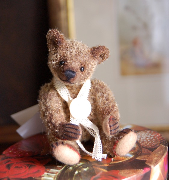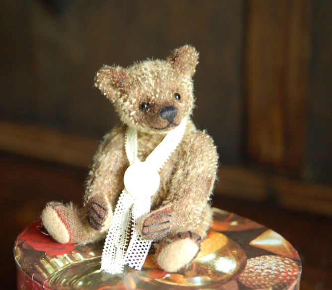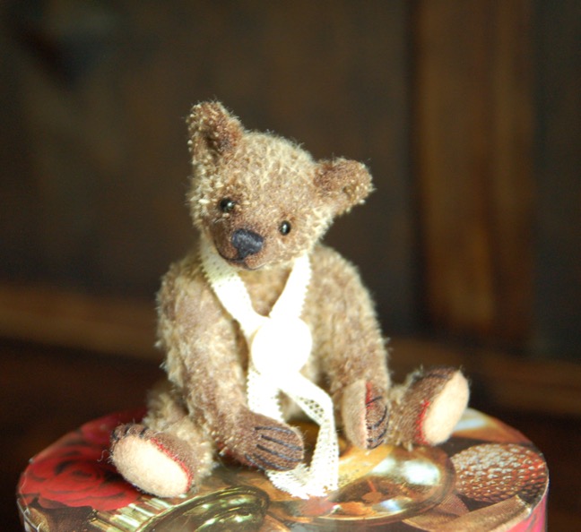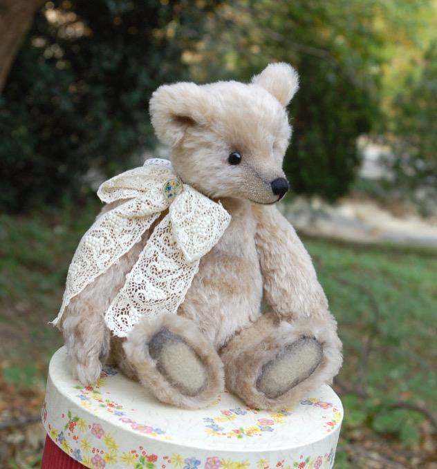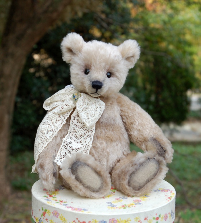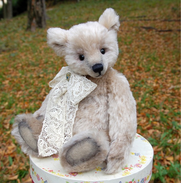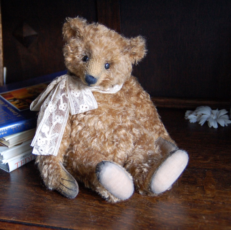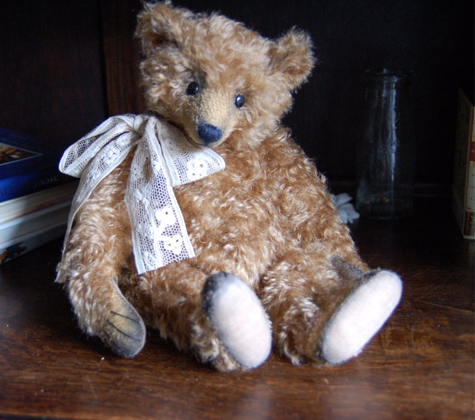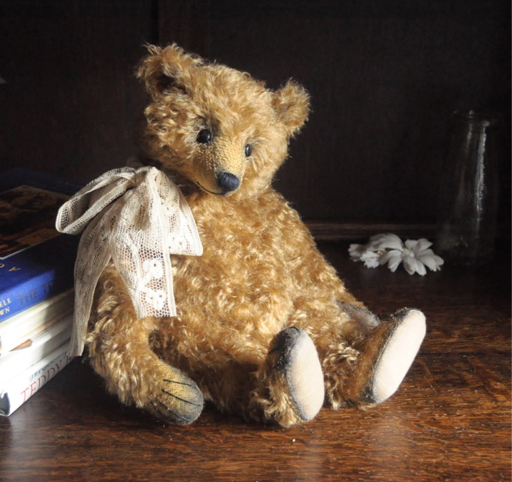 100年前のアーリーシュタイフに想いを馳せ、あんな風に愛され、静かに時を刻んで欲しいという願いが込められて生まれました。モヘアの色は渋いゴールド。光によってブロンズ色に見える時も。目はブーツボタン。手足のパットは薄いリネンの生地。縫い目は手でステッチされ、まるでアンティークベアの修理の跡みたい。細かいステッチを見ると、愛情をかけてもらったんだね、と胸が熱くなります。全身ほぼ木毛で、重みは入っていません。一緒に暮らす人がどんな風に接してくれるかで、体型も毛並みも変化していけばいいなと、作家さんの密やかな楽しみなのです。