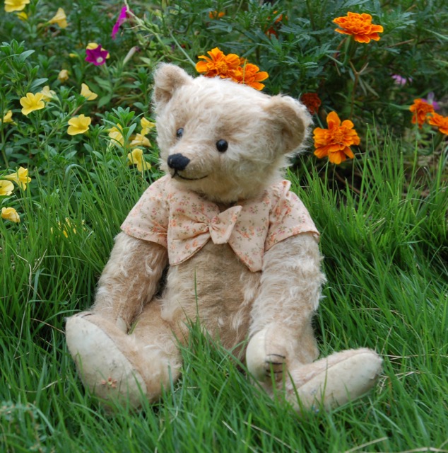 レディの国らしく、お帽子はお洒落に羽根飾りが付いています。まるで王室主催のアスコット競馬場で披露する淑女のお帽子みたいです。きっと当時パパとママと連れ立ってお茶会にお呼ばれしたお嬢ちゃまだったのかもですね。想像は膨らみます。大きなお帽子に合わせて、ちょっと頭も大きな嬢ちゃまですが、クマの社交界では頭の大きな幼児体型は美徳とされていますから、きっと社交界一の花形になれるでしょう。