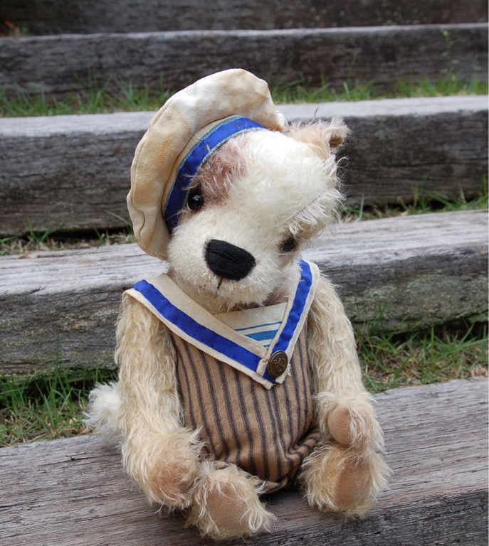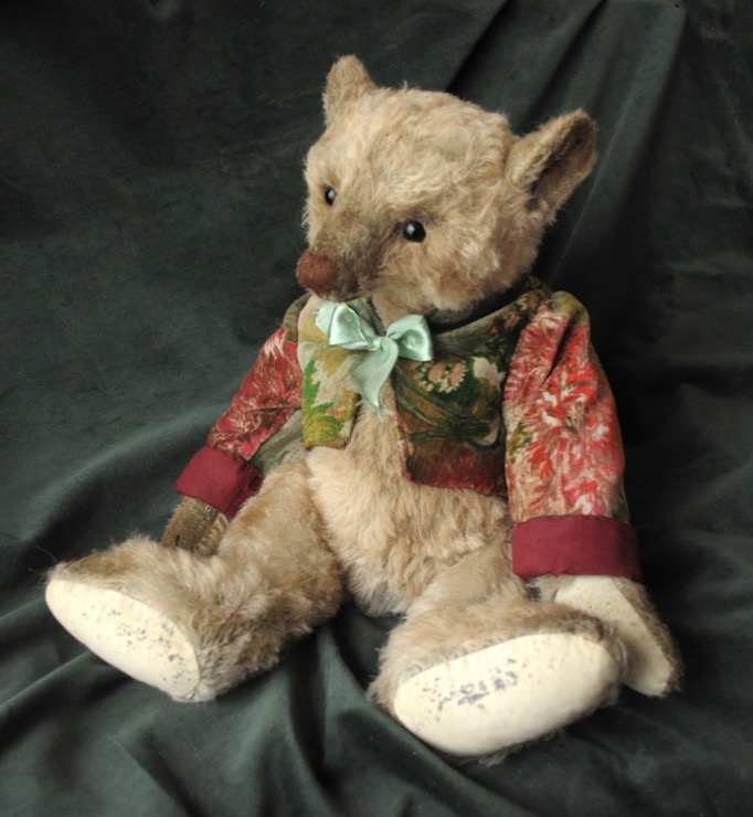 アンティークの洗礼服を着たまだ赤ん坊のくまです。身長は42cmですが抱くと弱々しく頼りなく、まだまだ保護者が必要です。守ってあげないといけません。夜寝る時もそばにいてあげないといけません。でもドレスの裾からのぞいた割合大きなアンヨちゃん。確実に育ってますね。きっといたいけな少女に育つでしょうね。